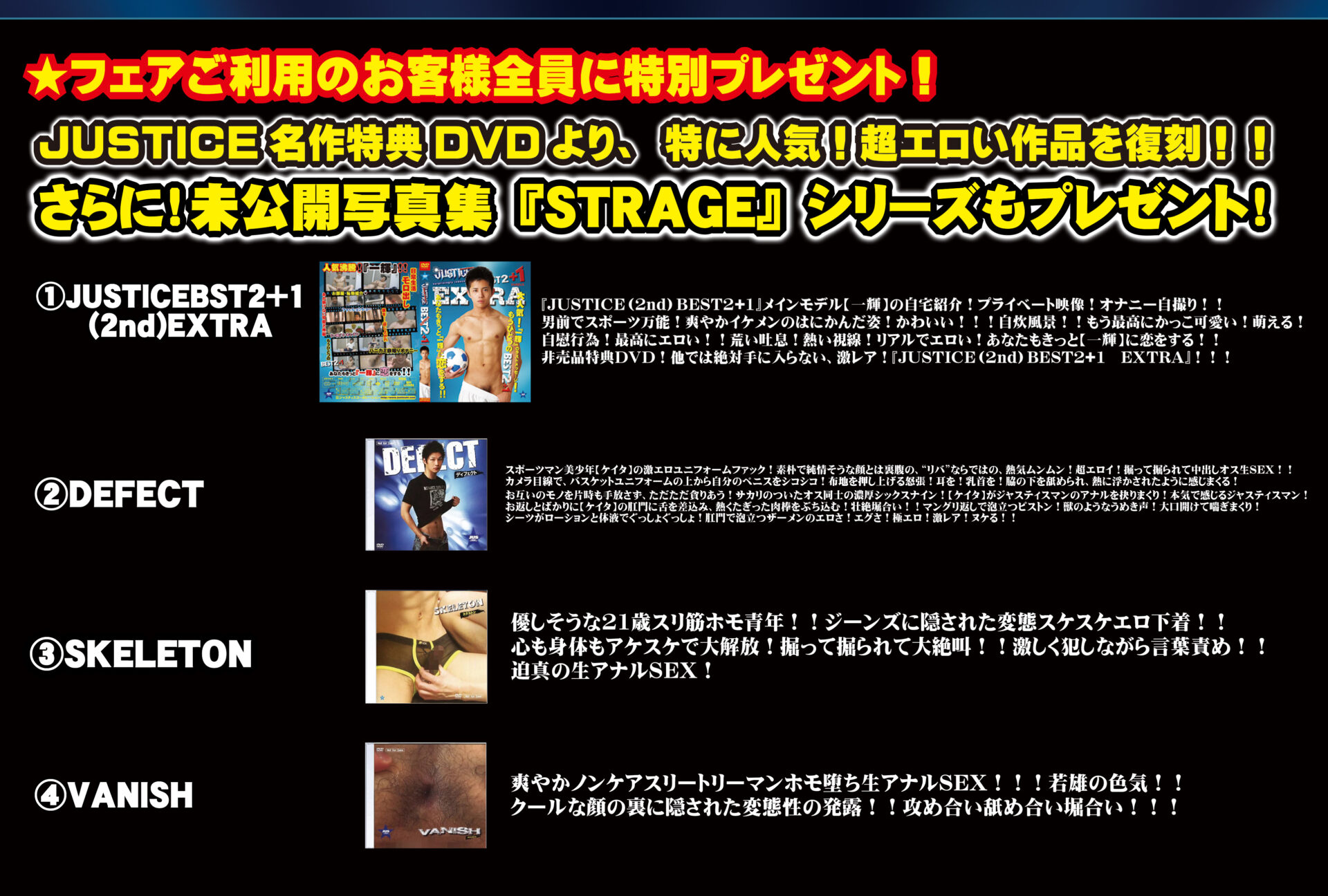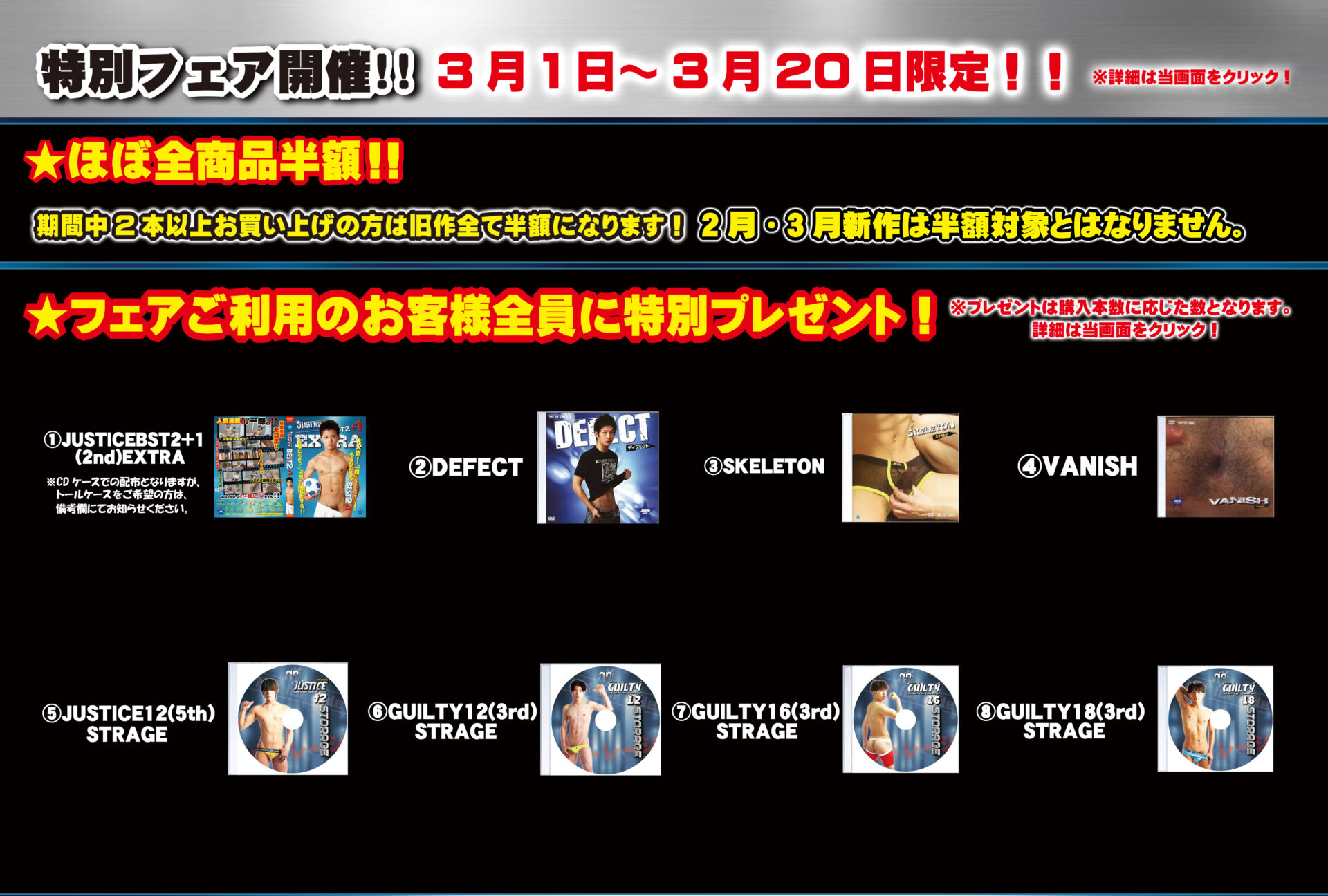 Top使用中_20260301用 2024.12.012026.02.28 New Release新作リリース What’s New新着情報 2026/02/28 3月1日~3月20日までの期間限定!特別フェア開催!詳細はこちら!!2026/02/28 2026年!3月作品!JUSTICE15(5th)!3月20日発売!詳細はこちら!!2026/01/30 2026年!2月作品!JUSTICE14(5th)!2月20日発売!詳細はこちら!!2025/12/27 2026年!1月作品!GUILTY18(3rd)!1月16日発売!詳細はこちら!!2025/11/30 2025年!12月作品!JUSTICE13(5th)!12月19日発売!詳細はこちら!! 3月20日発売!JUSTICE15(5th)! 【JUSTICE15(5th)とJUSTICE11(4th)のお得なセット】 オフィシャル購入なら!豪華オフィシャル特典がすべてもらえる!